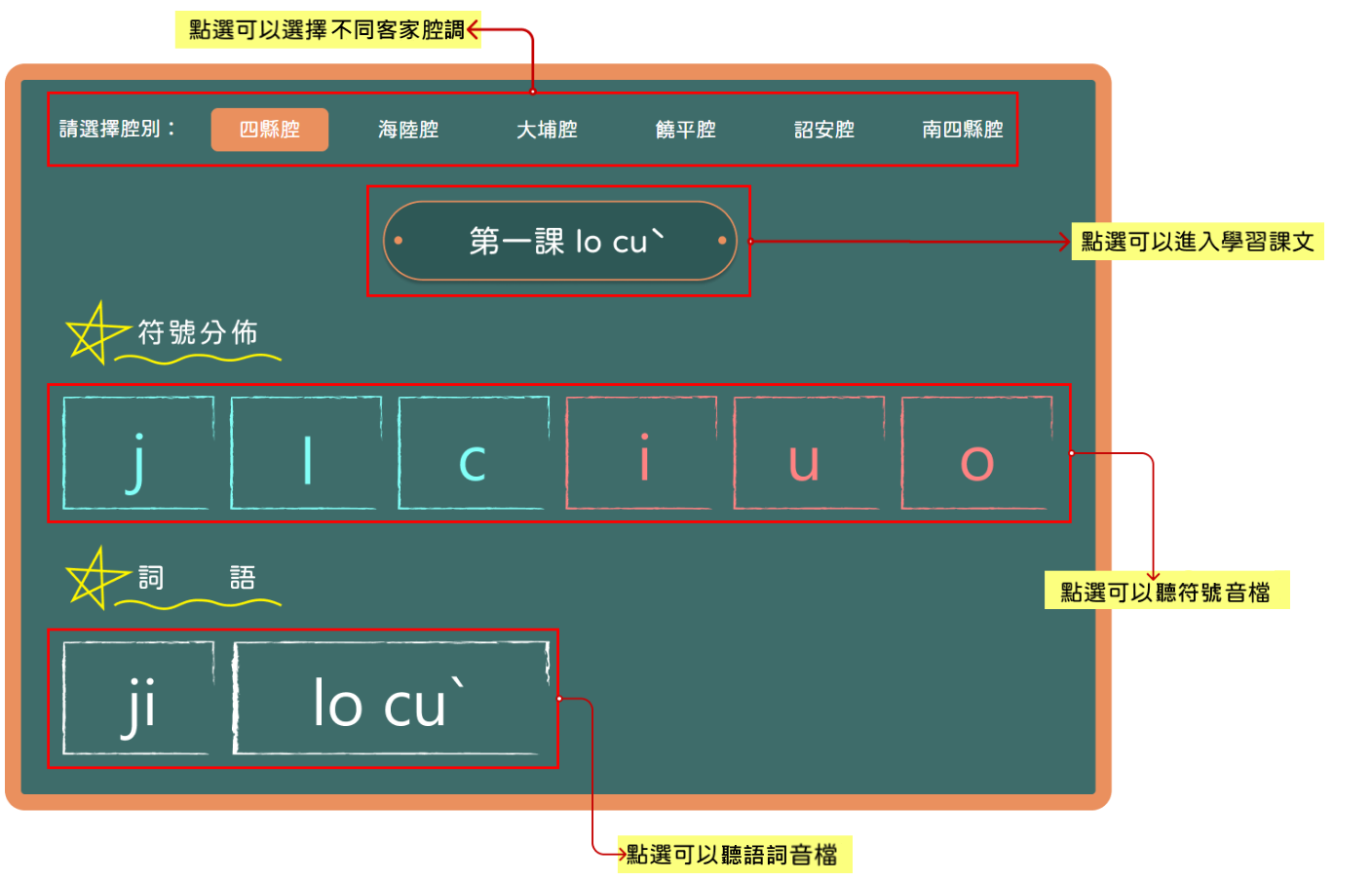 本網站是一個學習臺灣客語拼音的初級平臺,透過課文學習,帶入符號認識、發音與口型示範,提升學習準確度,並透過遊戲方式,檢視學習成效,同時提高學習趣味。